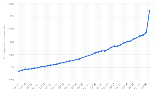 Did you know that Ecommerce now represents 16% of all retail sales? That's a HUGE increase from the same time last year. Just take a look at the graph below.